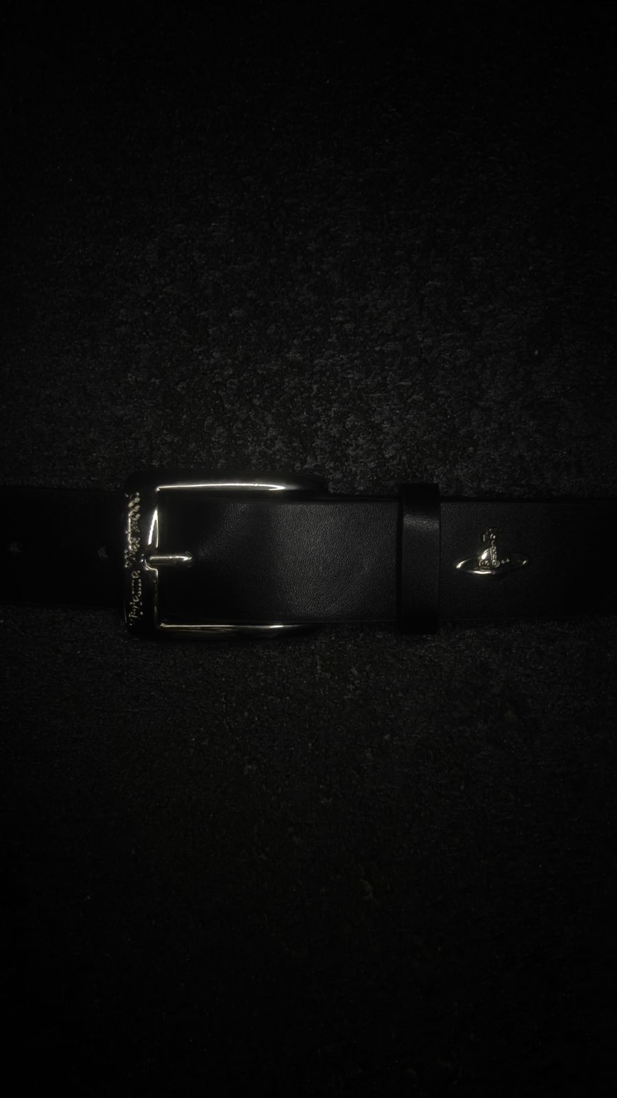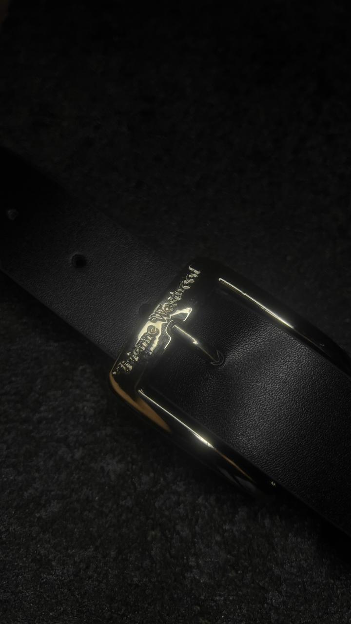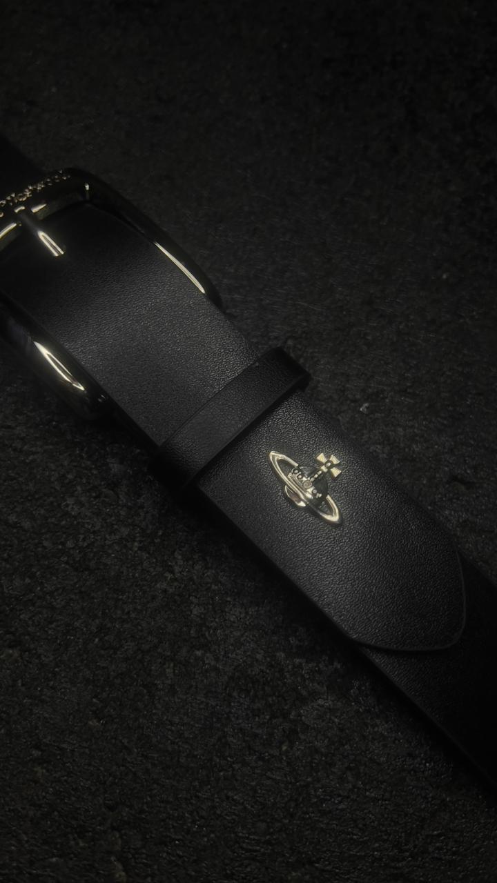 Hebilla de metal con baño de aleación cromada, orbe de saturno en la punta del cinto.